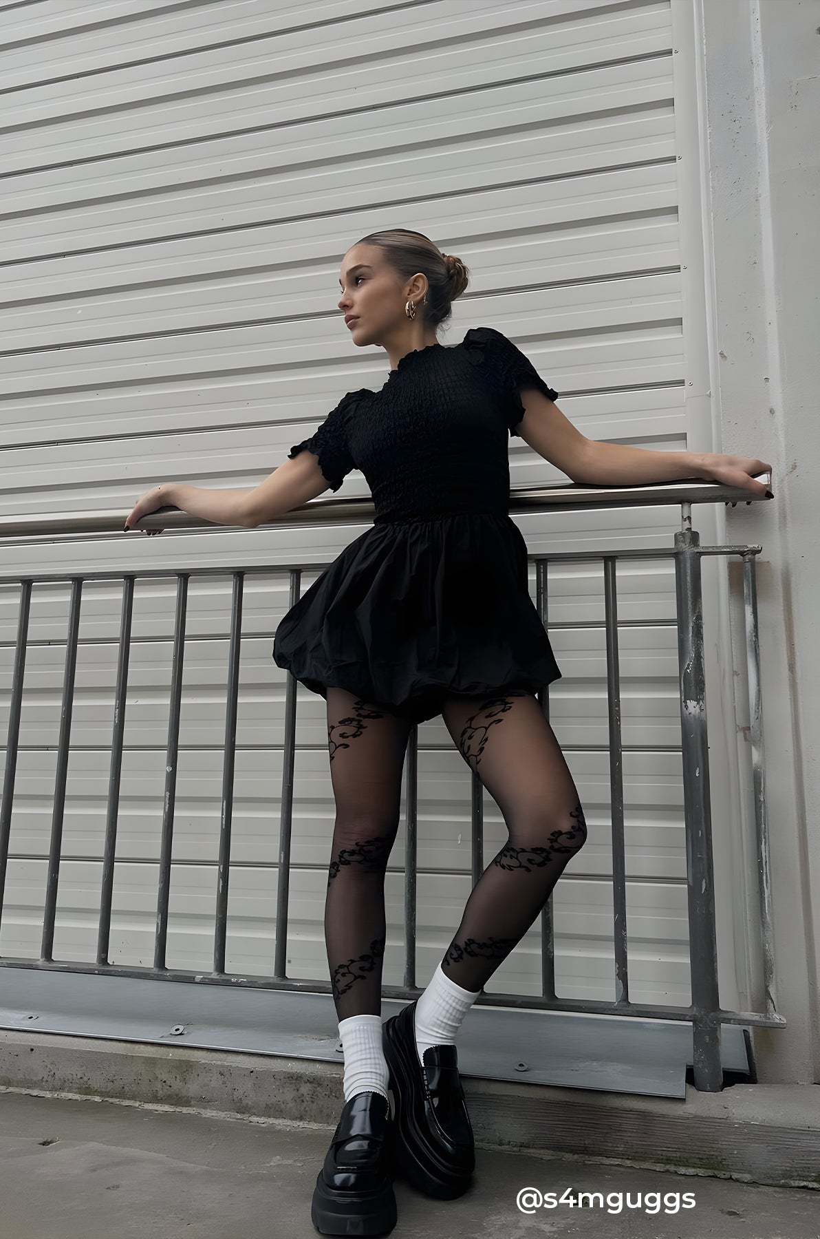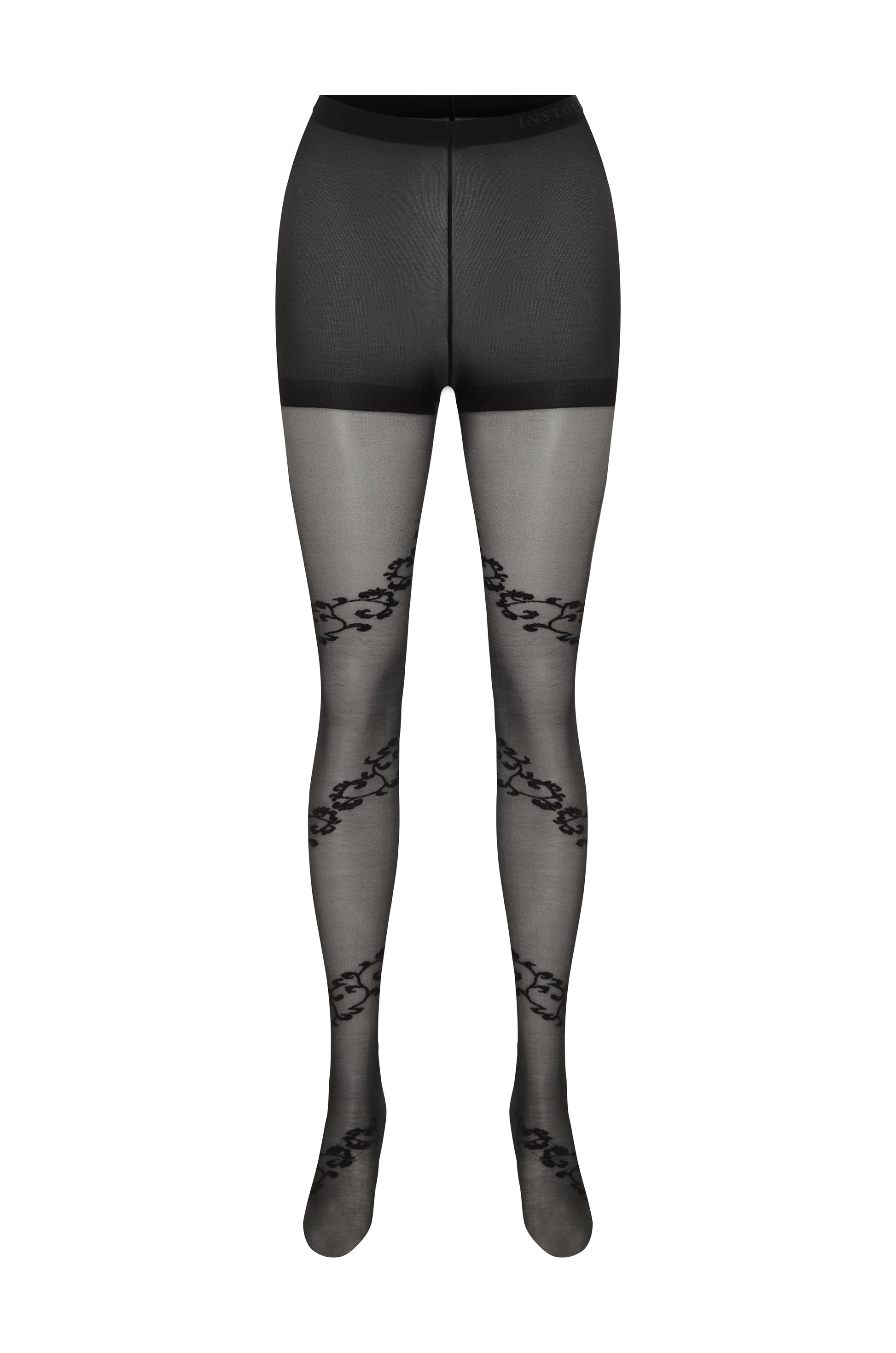 A sheer black tight with a simple, yet intricate vine design weaving up both legs. A story of endless love.
